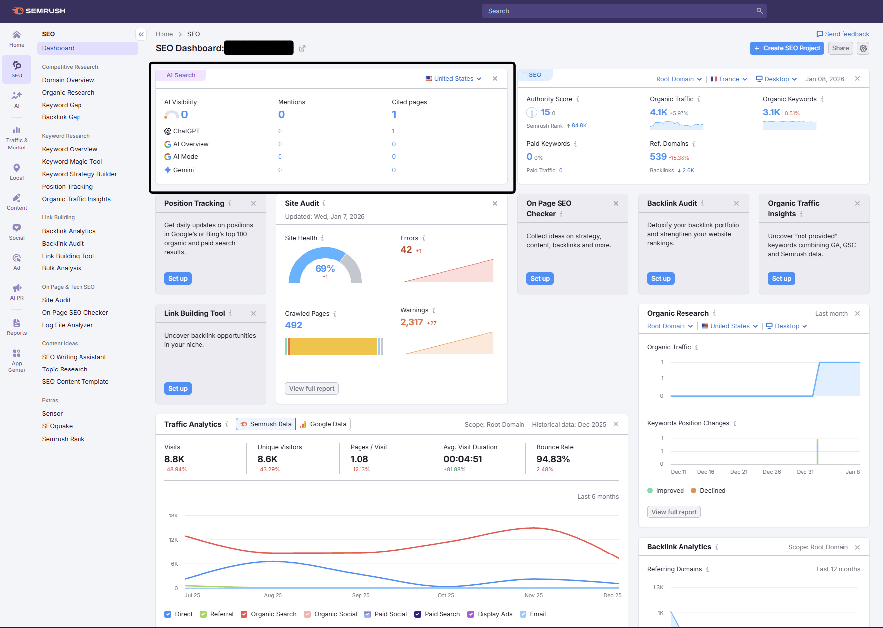 Utilisez des outils GEO pour tracker vos mentions dans ChatGPT, Claude, Google AI Overviews, Perplexity et Microsoft Copilot. Ces plateformes ont des taux d’inclusion de sources supérieurs à 90 %, mais les critères de citation diffèrent fortement. La version gratuite de SEMrush et Ahrefs peut vous donner une estimation de votre présence GEO.